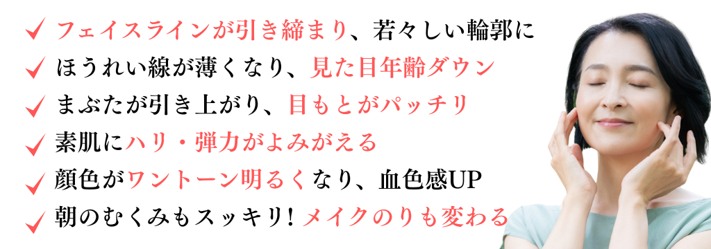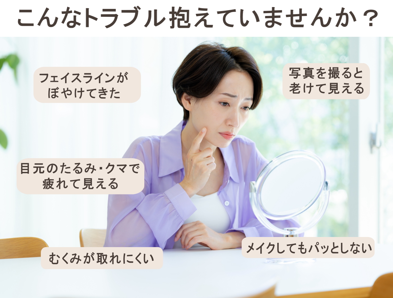 年齢とともに感じる、フェイスラインのゆるみ、顔の重だるさ、疲れて見える印象。